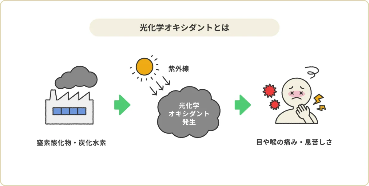 自動車や工場から出る排ガスには、窒素酸化物や炭化水素が含まれています。これらが太陽光にあたることで発生するのが光化学オキシダントという物質です。