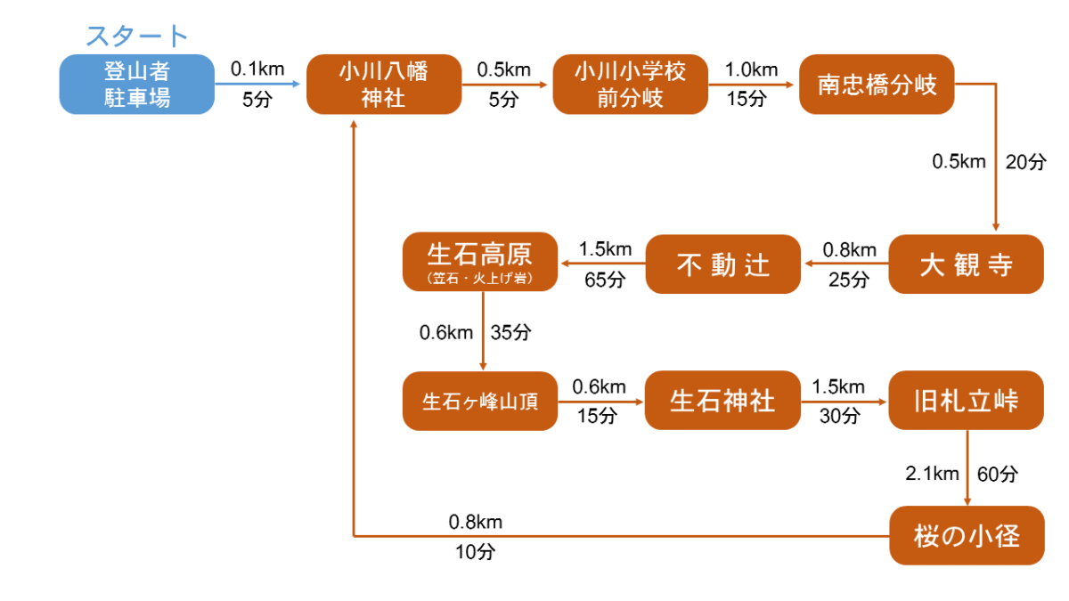 山頂を東に下ると、大汝、少彦名の二神を祀る生石神社に着きます。しばらく登山道を下ると、車道に出合い、そのまま車道を進むと、旧札立峠に着くので再び登山道を下ります。再び車道に出合うがこれを横切り、ジグザクの急坂を下っていくと、やがて一本松と呼ばれる平坦地に出ます。樹々の間に生石高原の北面を望む尾道を行き、舗装道を左へ、桜並木(桜の小径)を進めば小川八幡神社に帰り着きます。