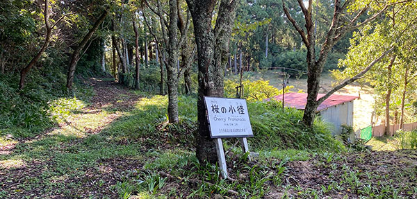 桜の並木道が続く「桜の小径(チェリープロムナード)」。春は素晴らしい景気が楽しめます。この看板を正面に、右へ進んでいきます。10分ほどで小川八幡神社の車道に行きつきます。